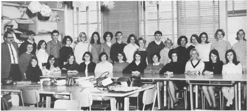 | Seated: Carol Fields, Carolyn Sargent, Sherry Jayne, Jean Blount, Sandy Johnson, Linda Foreman, Betty Henning, Delores Ertel, Carol Townsends, Nancy Eickelberger, Brenda Brockman, Kathy Reif. Standing: Mr. Pinkerman - Advisor, Beverly Rymer, Scott Whittlesey, Mary Evans, Larry Shelby, | Barb Foreman, Pam Faber, Sharon Einsfeld, Joan Bradford, Larry Thomas, Debby Wittman, Vicky Muddell, Bob Hofstadter, Arlita Bruce, JoAnn Raum, Beatrice Donges, Sandy Jenkins, Gayle Vaughn, Linda Thomas. |